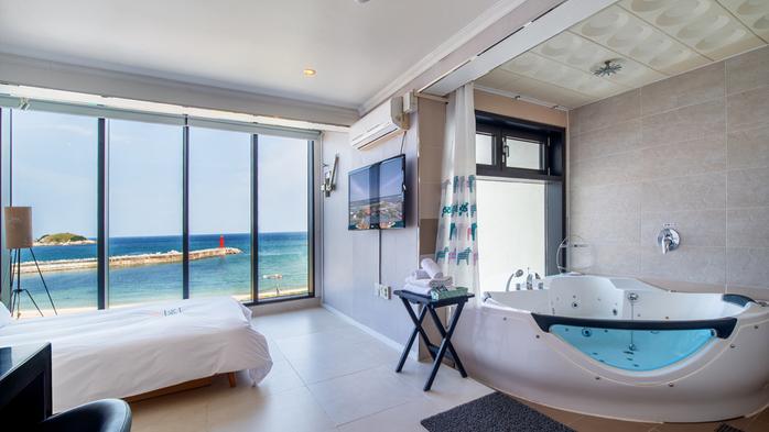 이 객실은 침실과 거실이 구분되어 있는 가족 전용 객실입니다. 객실 외부에는 야외 바베큐를 즐기실 수 있고, 해변은 도보로 3분 정도 걸어가시면 됩니다. 객실 내부는 저희 부부가 직접 인테리어하였기 때문에 다양한 감성을 느낄 수 있습니다. 저희가 아끼는 소품들도 내부에 비치하였으며 청결한 침구와 함께 편안한 휴식을 즐길 수 있습니다. 이 객실은 기준인원2인/최대인원5인 숙박하실 수 있습니다 :)
