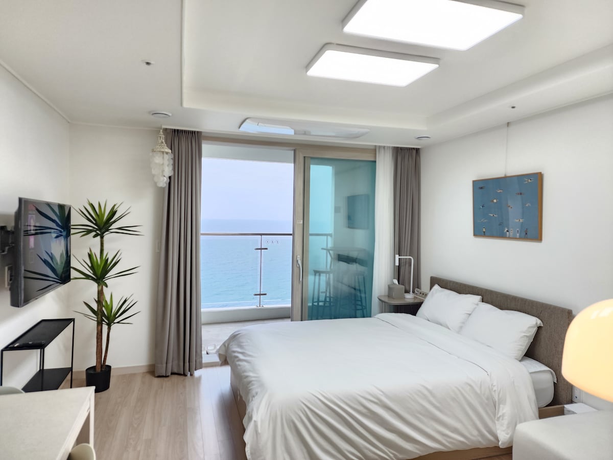 From the terrace, you can fully enjoy the ever-changing beauty of the East Sea, including the sunrise and sunset, with unobstructed ocean view. To enhance your stay, we provide Netflix w/ 65" TV and Harman Kardon Bluetooth speaker. If you connect the game console, you can enjoy over 3,000 nostalgic games. We have various lighting and blankets prepared to create a romantic atmosphere indoors and outdoors at night. For a comfortable sleep, we provide hotel-style bedding and blackout curtains.