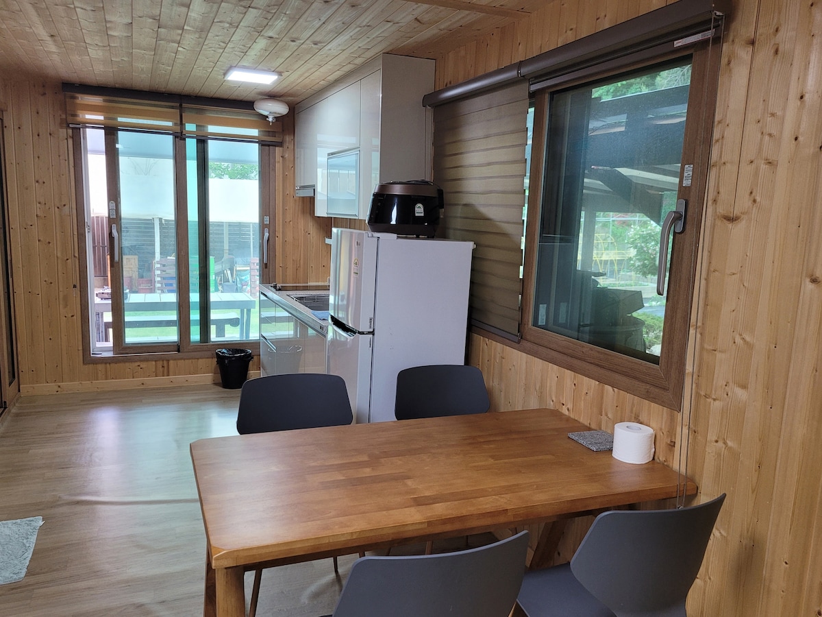 Host lives on the first floor, the guest accommodation on the second floor has a separate front door for guests. It is a place where hammocks are installed on the 495㎡ lawn, you can take a walk with pets, and provide optimal rest for those who want to rest quietly. If you bring barbecue parties and camping tools on the grass and balcony, (15,000₩ per barbecue) you can camp outdoors, pick up persimmons and chestnuts in autumn, and walk along the village trail (path) will also be a good memory.