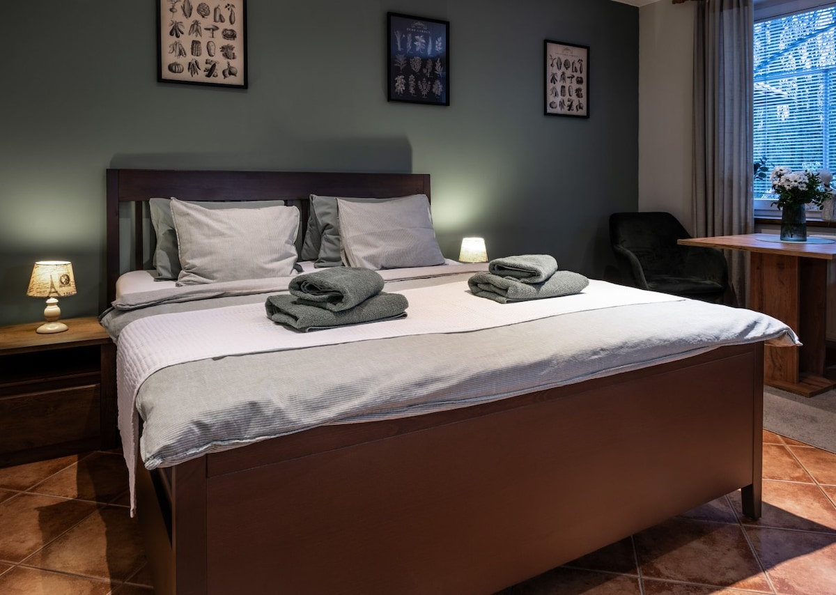 Romantické dvoulůžkové studio s manželskou postelí a vlastním vchodem přímo ze zahrady nabízí klid a soukromí. Útulný prostor s vlastní koupelnou doplňuje praktický kuchyňský mini koutek bez dřezu s lednicí, mikrovlnnou troubou, varnou konvicí a kapslovým kávovarem Bosch Tassimo. Ideální místo pro chvíle pohody ve dvou. Další vybavení: šatní skříň, komoda, dvě křesílka, stůl, ložní prádlo, ručníky.