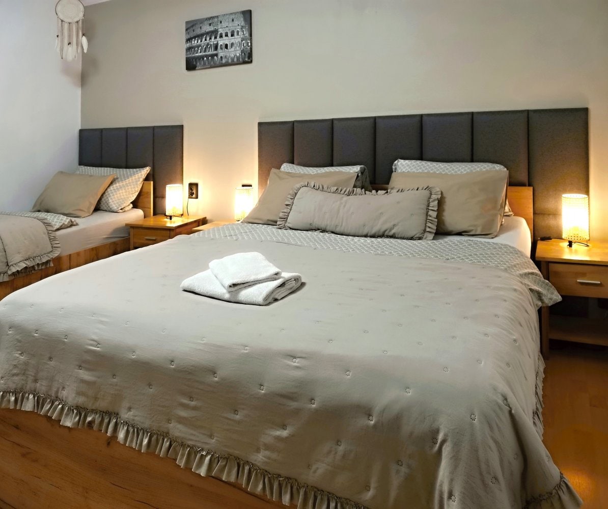 Zveme Vás k pobytu v našem příjemném třílůžkovém pokoji v patře penzionu. Pokoj s manželskou postelí a samostaným lůžem, doplněný o vlastní koupelnu, vytváří příjemné zázemí pro klidné dny i pomalá rána. Před pokojem můžete využít sdílený kuchyňský kout s posezením, vybavený lednicí, varnou deskou, mikrovlnnou troubou, varnou konvicí a kapslovým kávovarem Bosch Tassimo. Další vybavení pokoje: TV, šatní skříň, komoda, stůl, židle, proutěné křeslo, ložní prádlo, ručníky.