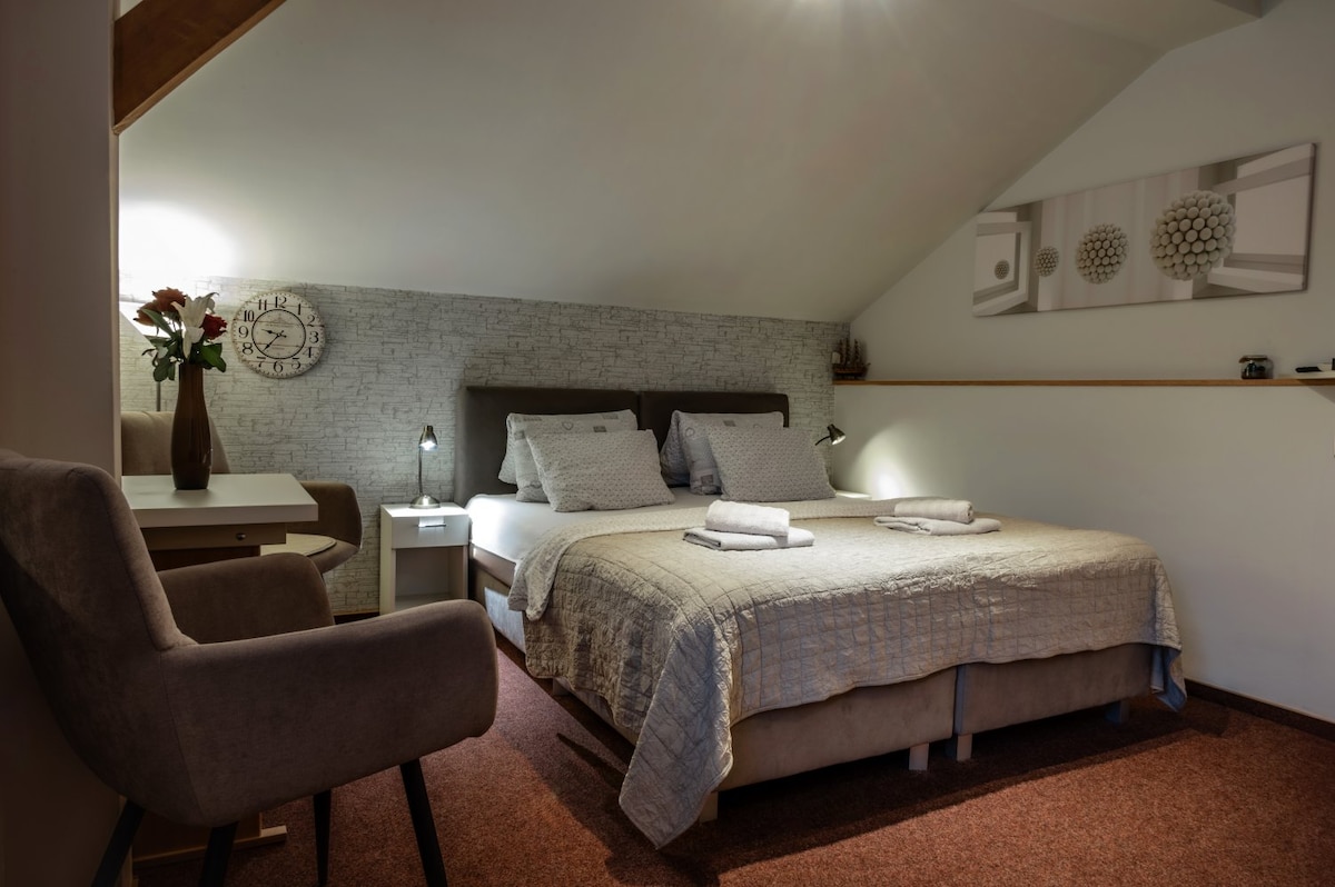 Příjemný dvoulůžkový pokoj s manželskou postelí situovaný v patře nabízí klidné zázemí pro pobyt ve dvou. Součástí pokoje je vlastní koupelna a výhled do zahrady. Před pokojem mohou hosté využít sdílený kuchyňský kout s posezením, vybavený lednicí, varnou deskou, mikrovlnnou troubou, varnou konvicí a kapslovým kávovarem Bosch Tassimo. Vybavení pokoje: šatní skříň, dvě křesílka, stolek, ložní prádlo, ručníky.