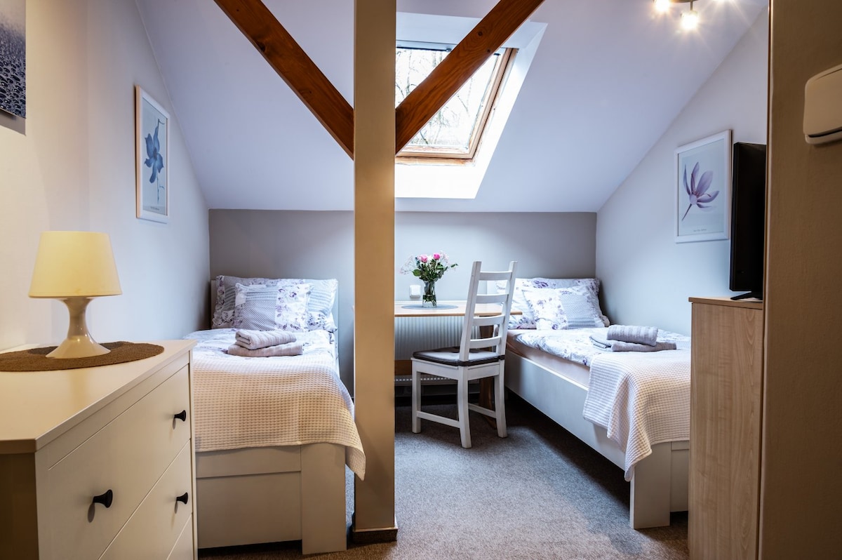 Náš nejmenší, ale příjemný dvoulůžkový pokoj se dvěma samostatnými lůžky, situovaný v patře penzionu, nabízí klidné zázemí pro pohodový pobyt. Součástí pokoje je vlastní koupelna a střešní okno, propůjčující prostoru osobitý charakter. Před pokojem mohou hosté využít sdílený kuchyňský kout s posezením, vybavený lednicí, varnou deskou, mikrovlnnou troubou, varnou konvicí a kapslovým kávovarem Bosch Tassimo. Další vybavení pokoje: šatní skříň, stůl, židle, ložní prádlo, ručníky.