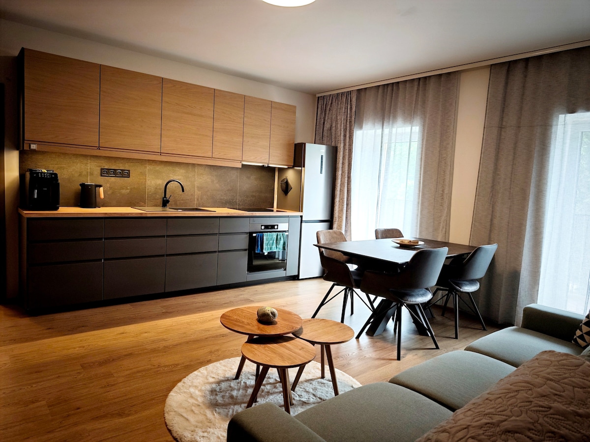 Stylový apartmán s vlastní zahrádkou v blízkosti Plešivce. Apartmán s dispozicí 2 kk má dostatkem prostoru až pro 4 osoby. Komfort zajistí 1 samostatná ložnice s pohodlným manželským lůžkem, obývací část s rozkládací pohovkou a plně vybavená kuchyň s jídelním koutem. Pro hosty jsou připraveny všechny lůžkoviny i ručníky. Nadstandardní zázemí zajišťuje kolárna a lyžárna s uzamykatelnými boxy i zásuvky pro nabíjení elektrokol, společná prádelna, sauna za poplatek, mycí box pro kola.