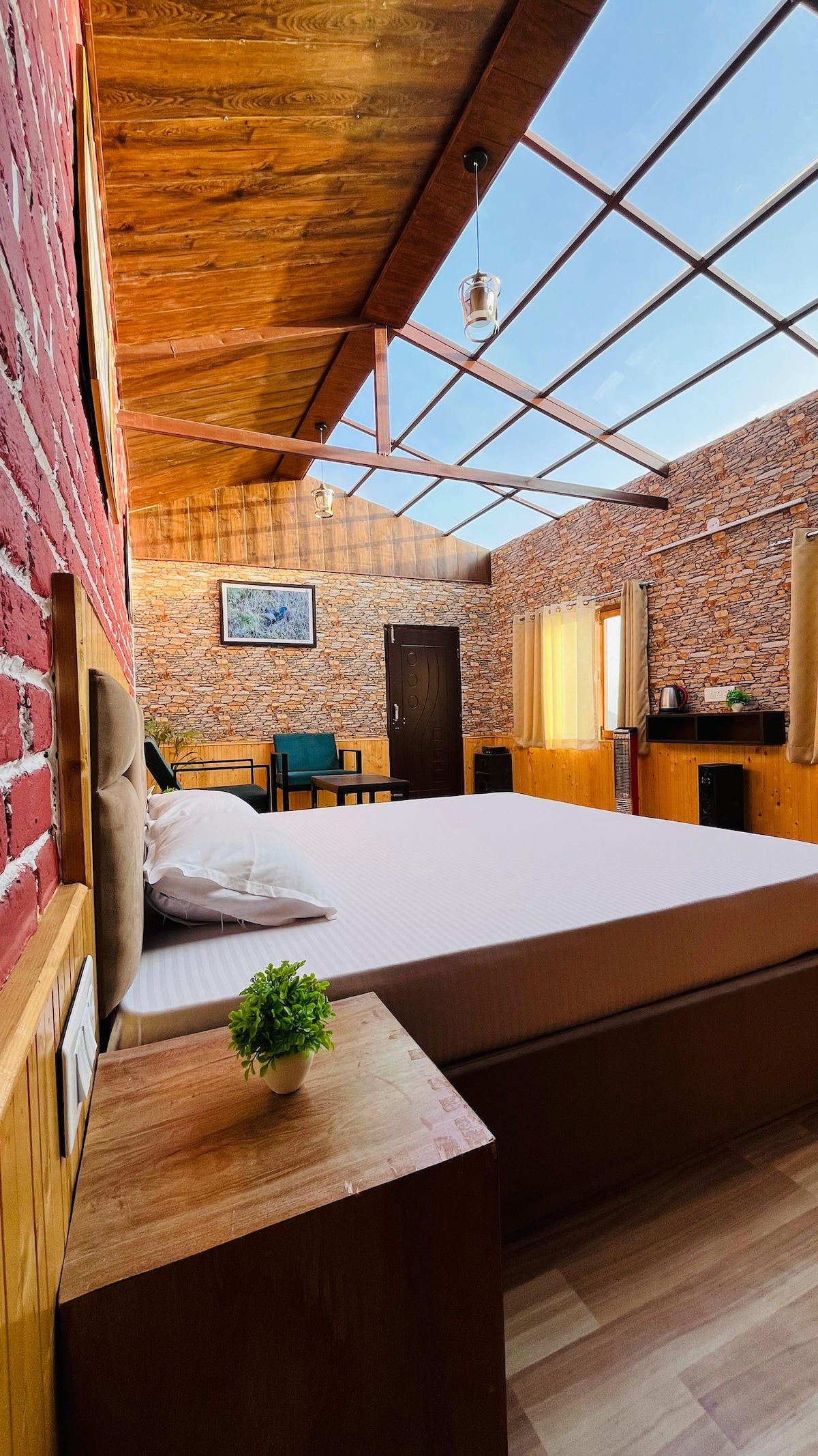 Relax with the whole family at this peaceful place to stay. Located amidst nature, The Duplex Cottages offers a Beautiful Bedroom Space with Modern wooden interiors and Amenities and its attach with a single washroom. No Room in the hills feels like one without being able to Ever Sit outside and embrace the marvelous beauty of Hills, a spacious Open Sitting area is the plus that makes the experience outstanding. 1. Parking available in the property- 10+ cars 2. Lawn area with furniture