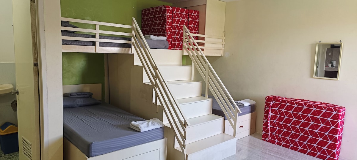 Experience serenity in our studio apartment, complete with two single double-decker beds, an en-suite bathroom, kitchen facilities, AC, and a rear balcony. Suitable for students requiring a peaceful study environment and families seeking a rejuvenating staycation.