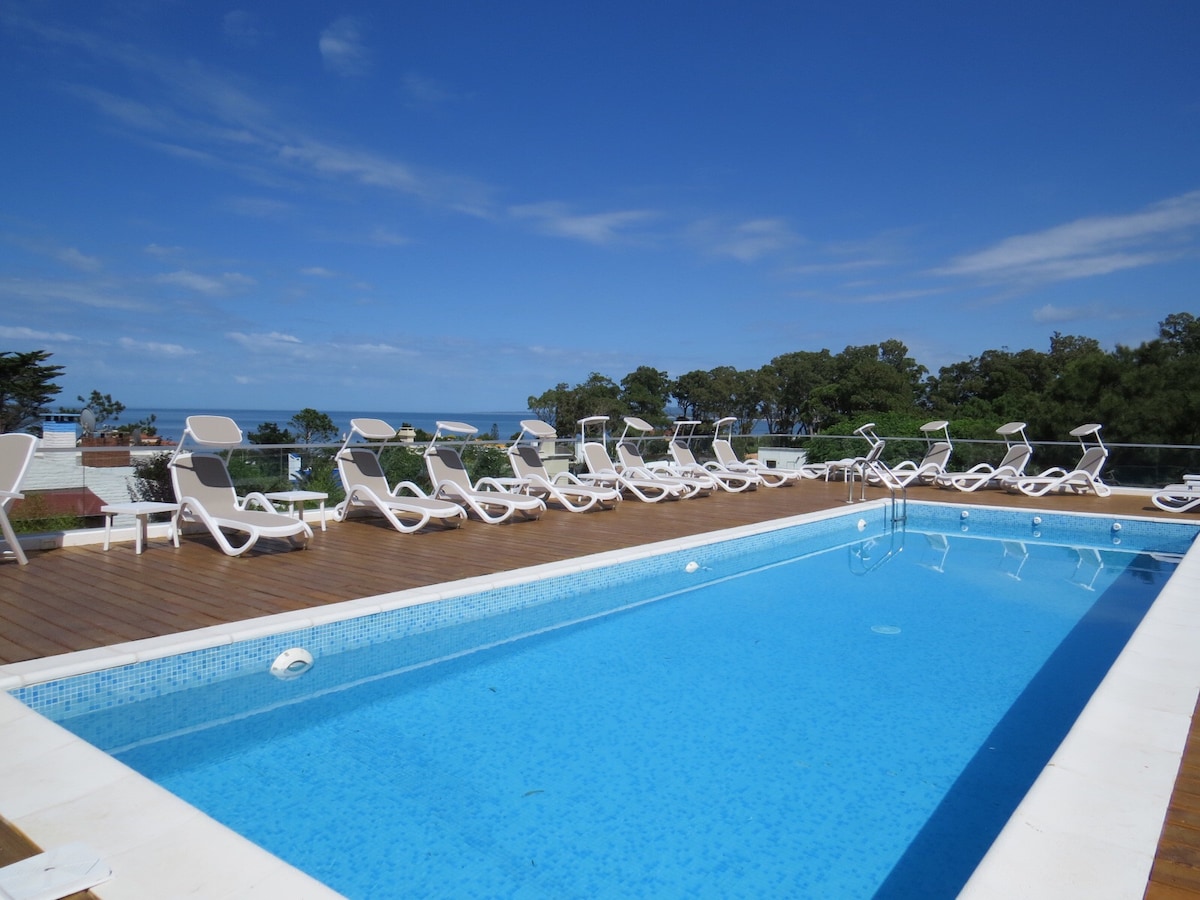 Piscina interior habilitada! Apartamento moderno, de lujo cómodo y completo, ideal para todo el año, a metros del Casino Conrad para disfrutar a pleno a 1 cuadra de la playa mansa. Con 2 dormitorios, 2 baños y toilette. Ventanales con vista al mar, terraza con jacuzzi propio. Este apartamento ofrece todos los servicios para que se sienta como en un hotel 5 estrellas (piscina climatizada, abierta, jacuzzi, sauna, gimnasio, canchas, playroom, barbacoa) servicio mucama y playa a diario.