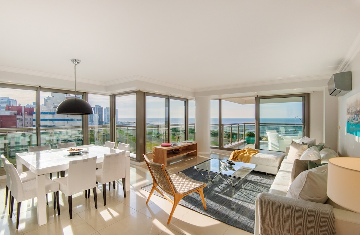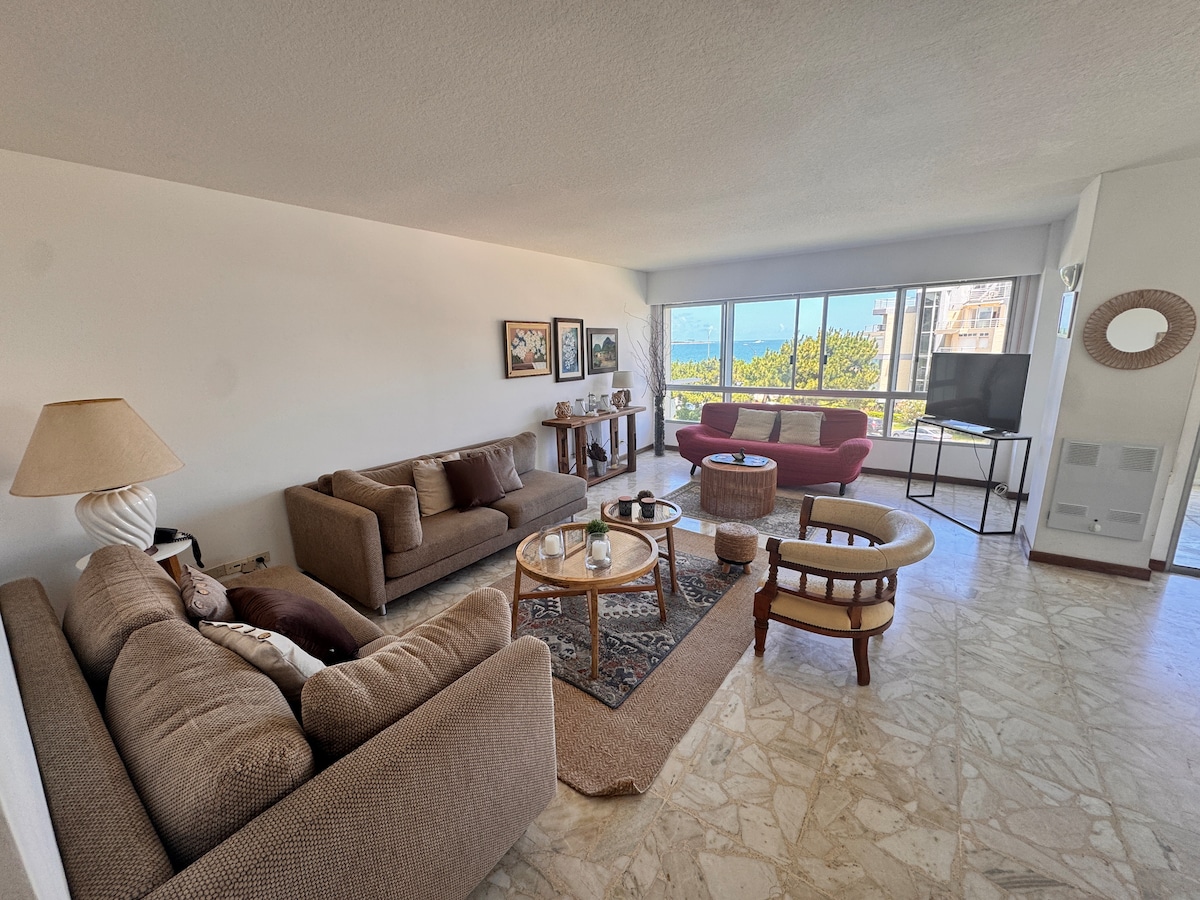 Elegante y espacioso apartamento en la península de 3 dormitorios y 3 baños (uno en suite) para 6 personas con amenities en una de las mejores zonas de Punta del Este. Se destaca su amplio balcón al frente con vista al mar y a la rambla con sillas y mesa. Tiene salida a la rambla para caminar por la costa y llegar hasta los Dedos. Ubicado privilegiadamente a 200 m de calle Gorlero, a 300 m de la lujosa calle 20, cerca del puerto de yates y zona de restaurantes , cafés y comercios