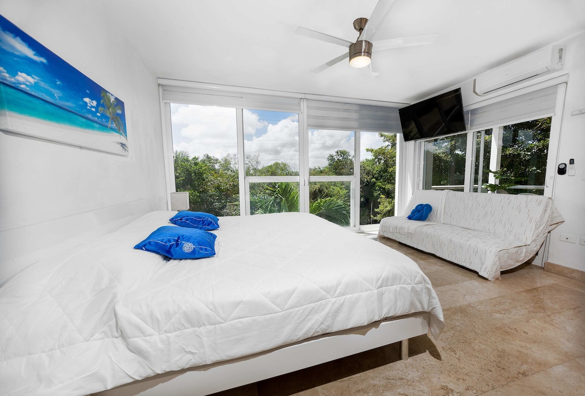 Fresh & funky jungle-facing, artistically designed condo in a brand new complex, just a 1.5-hour commute from Cancun airport. This 3 bedroom, 3 bathroom unit is the perfect backdrop for memories that will last a lifetime-- our spacious villa is ideal for families or groups of friends looking to escape and relax in paradise. Book your stay with us today and make unforgettable memories in Akumal!