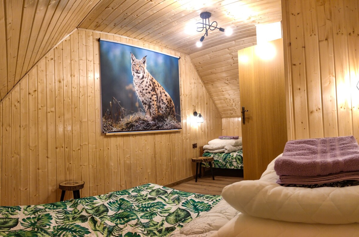 Dwa drewniane domy łączące lokalny styl z nowoczesnością i wiejskim charakterem. Otwarte przez cały rok, każdy podzielony na dwa niezależne apartamenty (48 m² + 15 m² taras), z osobnym wejściem, aneksem kuchennym, salonem, dwiema sypialniami i łazienką. Wszystkie sypialnie posiadają balkon z widokiem na piękną okolicę bukowego lasu lub daleką panoramę Połonina. Na terenie obiektu znajdują się aż dwa place zabaw z trampolinami dla naszych najmłodszych Gości.