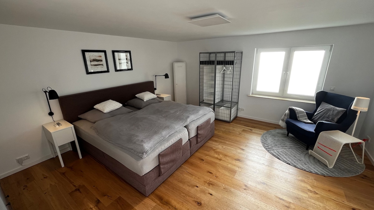 Ideal gelegen für Messebesucher Top Unterkunft für Familienurlaub ca. 130 qm Wohnfläche über 2 Etagen Große Terrasse mit erhöhtem Garten/-Waldblick und eigenem Waldzugang Fitness Raum Finnische Sauna für 6 Personen (Aufpreis) Profi-Wohnküche mit 6 Personen Esstisch und TV Formelles Esszimmer mit 6 Personen Esstisch Großes Zimmer inkl. zwei Doppelbetten und eigenem Bad im 1. OG Master bedroom und zweites Schlafzimmer im EG mit Bad Smart TV Geräte in allen Schlafräumen und Küche