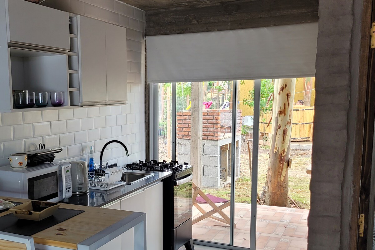 NUEVO A ESTRENAR! Balneario Las Flores, a 3 cuadras de la playa. Con vistas a los cerros, arbolado. Apartamento con 1 dormitorio, baño y cocina independientes! Terraza al frente y al fondo, parrileros, hermosas vistas, muy luminoso. Tina de madera con agua caliente de uso común en el corazón del jardín del complejo (4 apartamentos) este espacio tan tranquilo y elegante. Cocina equipada, todo nuevo! Para disfrutar de la naturaleza y el mar. Wi fi. Parrillero.