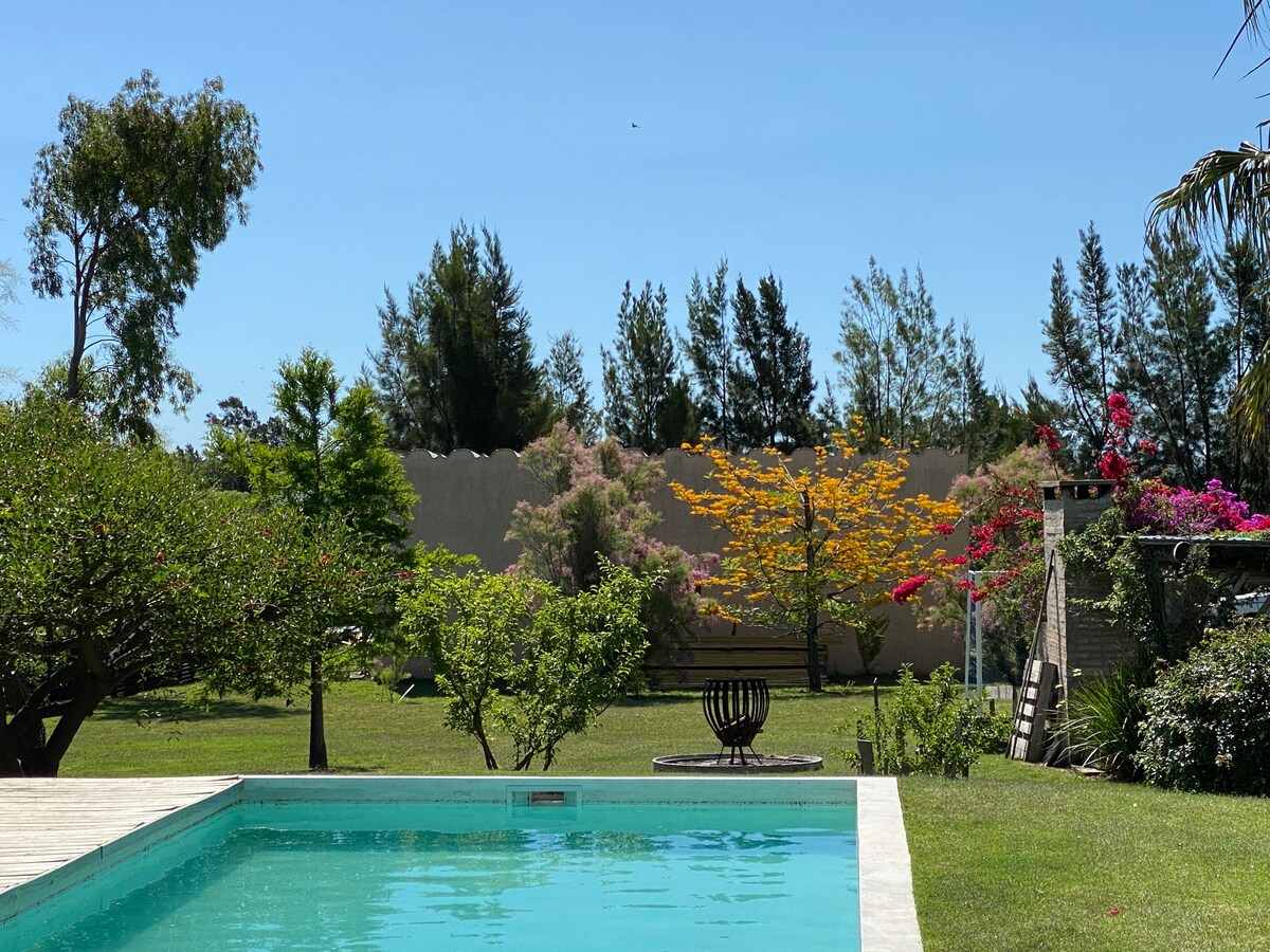 Para descansar en el silencio de la naturaleza, rodeado de pájaros, a la sombra de fresnos y liquid ambars. Cabaña de 3 dormitorios con 2 camas dobles y 2 simples + cocina + heladera y freezer + 2 baños completos +living + 2 aleros grandes, donde pasa toda la actividad + parrillero techado con dormitorio externo + Wi-Fi + TVbox + pequeña piscina o jacuzzi exterior con hidrojets masajeadores muy disfrutable + lavarropas A 6 cuadras de una de las playas mas lindas de la costa uruguaya