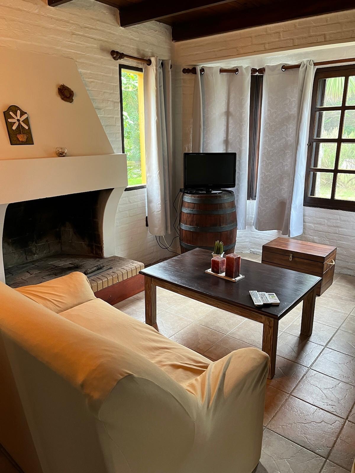 Preciosa casa nueva con dormitorio con cama matrimonial, cocina integrada al comedor y alarma. Ambas habitaciones con aire acondicionado y tv en el cuarto. Cocina y anafe eléctricos. Baño completo con ducha higiénica. Terreno de 1200 mts con diferentes espacios: lugar para colgar dos hamacas, espacio para hacer un fogón, troncos para estar alrededor o simplemente sentarse en sillas debajo de los árboles. Cuenta con parrillero simple móvil. Parada de ómnibus a 2 cuadras. No se aceptan mascotas.