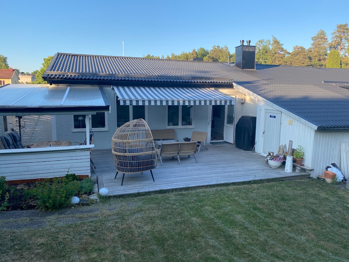 Cozy house in Barkarby – just 15 minutes by commuter train to Stockholm City. Four newly renovated bedrooms, two bathrooms, a fully equipped kitchen, TV room, and a glass-enclosed patio. Large garden with outdoor seating areas. Fast fiber internet. Located in a quiet residential neighborhood close to nature, shopping in Barkarbystaden, and excellent public transport connections. Perfect for families, friends, or business travelers who want to combine city life with relaxation.