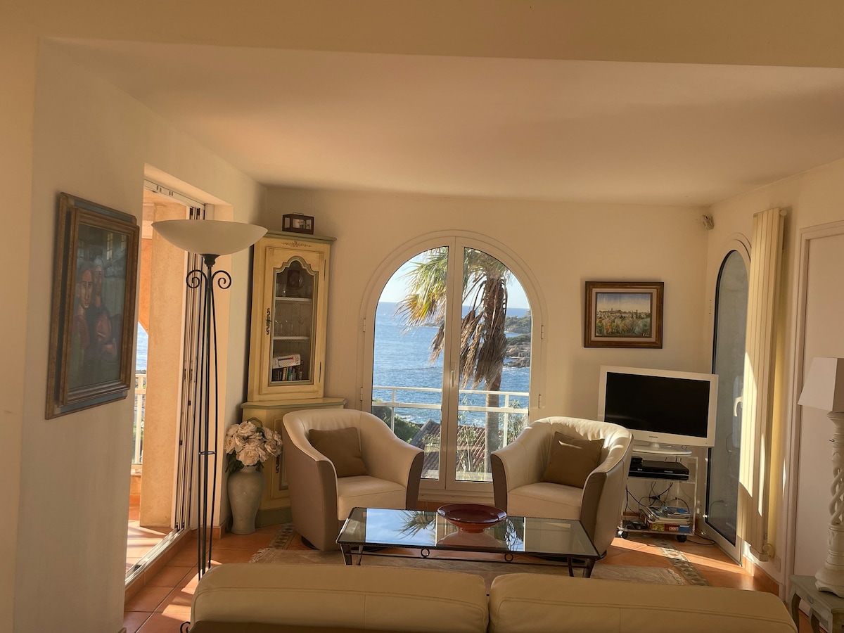 SANARY - Superbe Appartement 70m2 (T 2), rénové, petite résidence 5mn à pied du centre, des commerces et restaurants. Grand garage fermé. Prise véhicule électrique Tesla offert. CLIMATISATION Juin 2025. 3ème et dernier étage , face à la mer, vue imprenable sur le port de Sanary. Prestations de qualité. Chambre lit double 160. Grand séjour, salle à manger, salon, lit adulte banquette (2x90 cm). Vue mer pour toutes les pièces. Grand balcon mobilier extérieur. Salle de bain spacieuse. WC séparé.