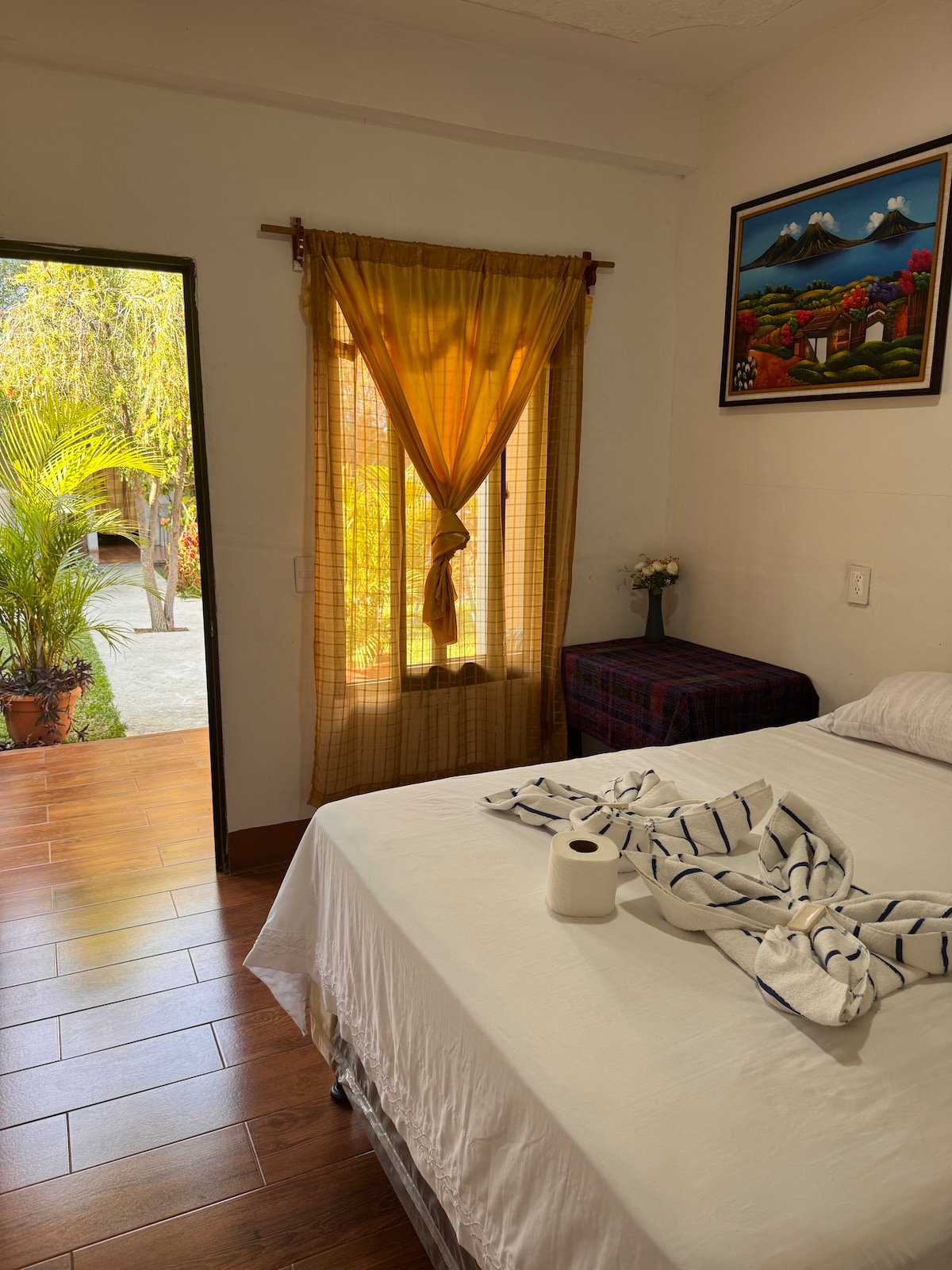 This refined room captures the essence of contemporary architectural elegance. It features clean lines, an expansive glass window overlooking the lake and three volcanoes, a spacious rooftop terrace, and meticulous attention to detail. Situated just 20 meters from the lake shore amid private gardens with endless lake views, it offers a serene and stylish retreat. We provide breakfast upon reservation for an additional fee of Q200/$25 per person and a 15% service charge.