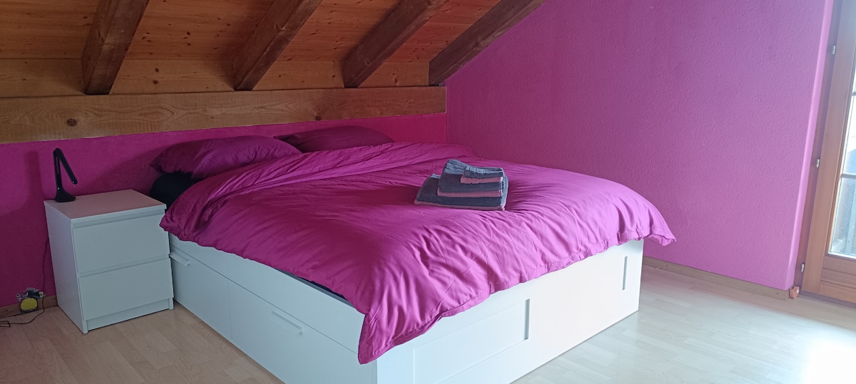 Unsere ruhige Unterkunft ist ideal für Naturliebhaber und Erholungssuchende. Umgeben von wunderschöner Landschaft, bietet es atemberaubende Aussichten, frische Luft und zahlreiche Wanderwege direkt vor der Tür. Das Bett ist 1,40x2m und unter dem Bett befinden sich noch mehr Bettlaken. Die Sessel lassen sich aufklappen. Also perfekt zum lesen oder auch für weitere Schlafmöglichkeiten ( max. 2 Kinder/Personen). Optional kann man für 10 CHF ein Babybett dazu buchen.