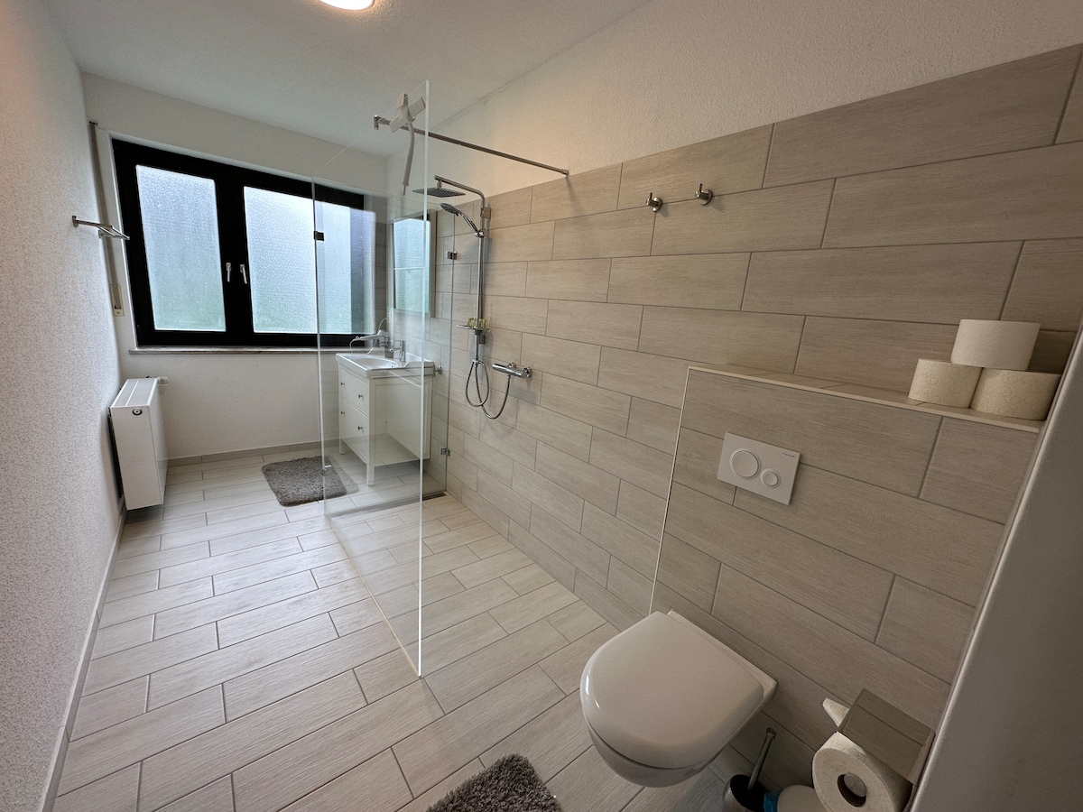 Helle, moderne und geräumige Bungalow-Dachgeschoss Ferienwohnung mit leistungsstarker Klimaanlage, 80 qm, für 1–5 Pers., in ruhiger Orts- und Waldrandlage! Großes Wohn- und Esszimmer (inkl. Doppel-Futonbett) , Schlafzimmer mit Doppelbett, Gästebett, Küche (mit Geschirrspüler), Wannenbad. Zentral gelegen zu allen Freizeitparks. W-LAN, Waldterrasse mit Feuerkorb und Grill, ausreichend Parkmöglichkeit vor dem Hause, Nichtraucherwohnung (Rauchmöglichkeit vorhanden), English speaking.