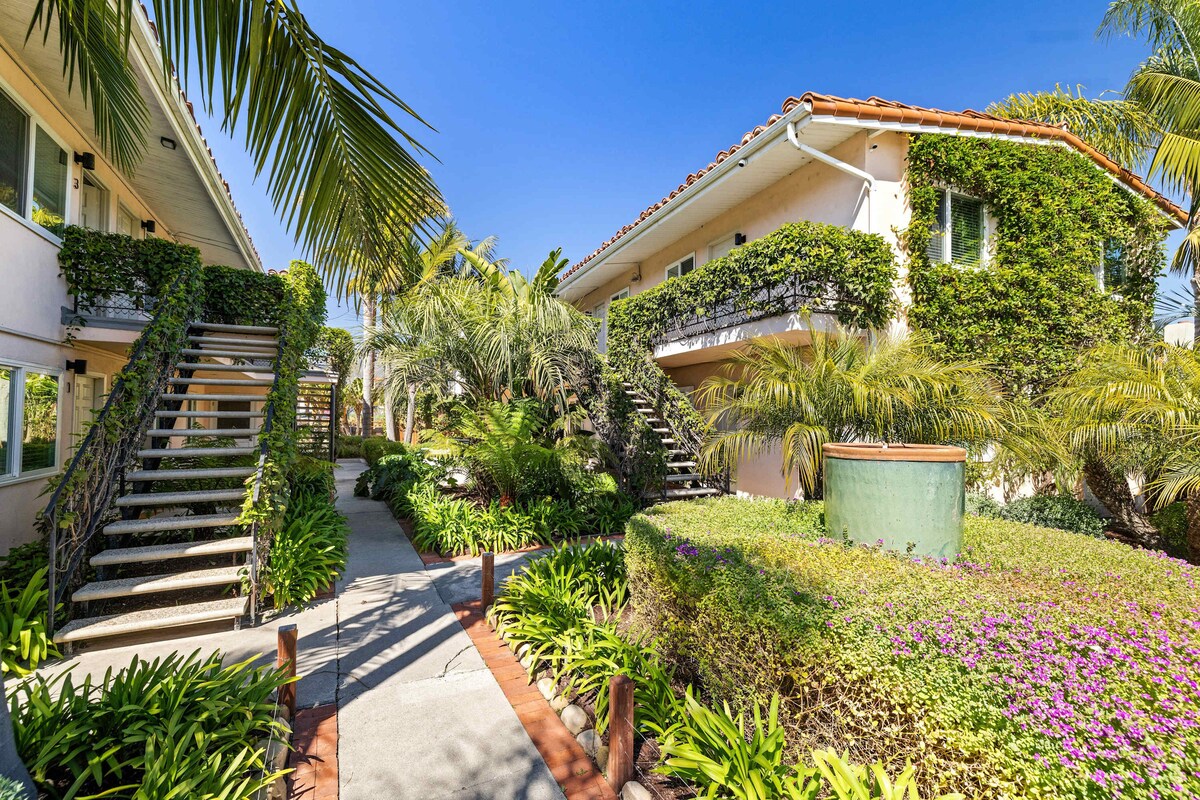 Tucked away in a tropical courtyard this fully renovated 1 bedroom apartment with full kitchen and living room has everything you'll need for your next SB getaway! King sized Casper bed with hotel quality linens, bathroom products from Public Goods, and Ralph Lauren towels. Fully equipped kitchen, living room with comfy sofa and 48" flatscreen TV. Tea and coffee service provided. Pet friendly and free private parking. Be one of the first people to stay at this recently remodeled apartment!