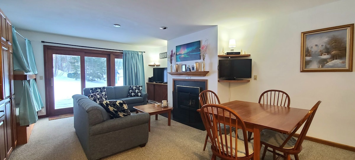 This cozy and comfy ski in/ski out condo is in a desirable location and just a short chairlift ride to the base of Sugarloaf Mountain. Ski or mountain bike directly from the condo! Family friendly. A queen bed settled in an alcove, queen murphy bed and pull out full size sofa bed provide plenty of sleeping space. Convenient indoor access to the pool, hot tubs, and sauna at the Sugarloaf Sports and Fitness Center (additional fees apply). Full kitchen, and one of the few with AC for summer!