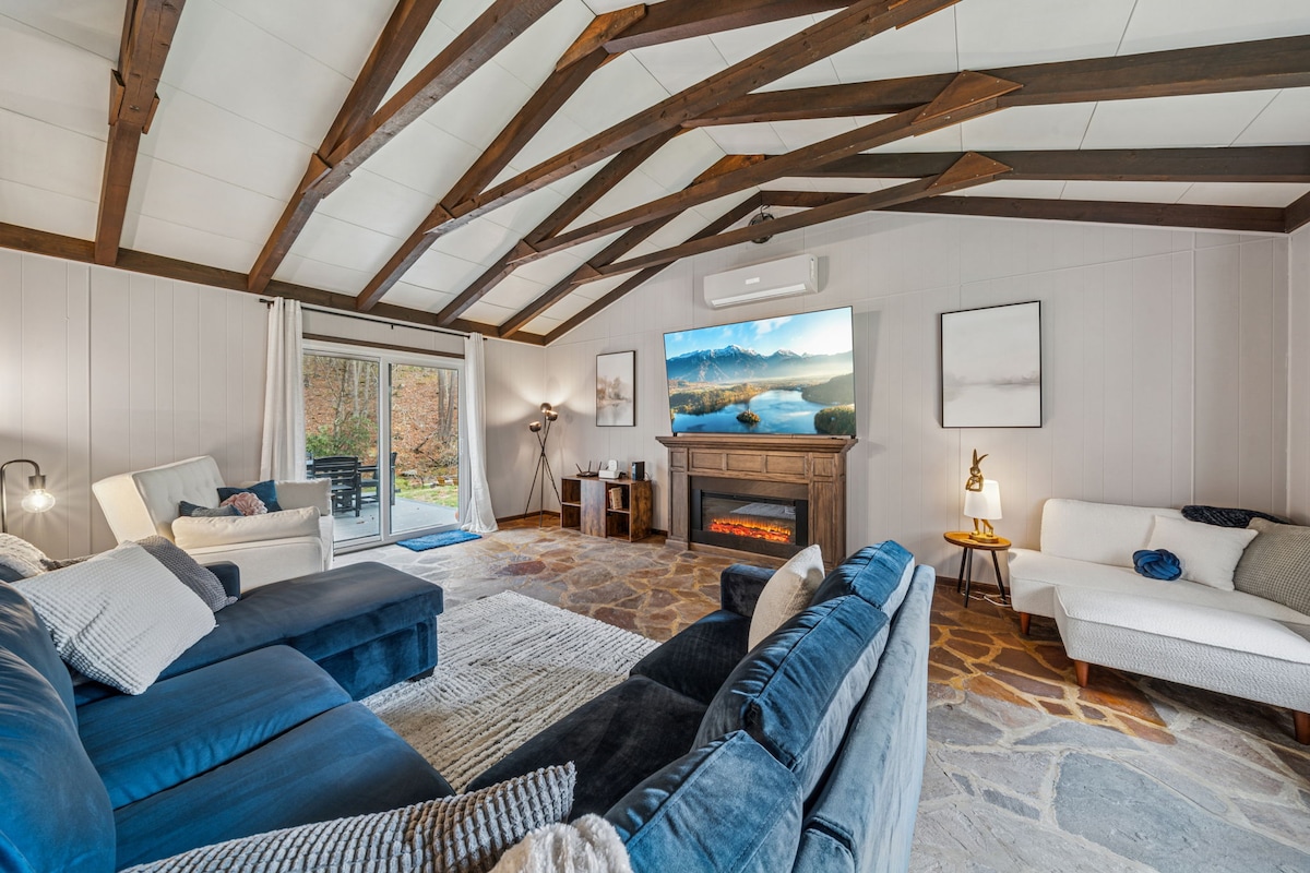 Experience an enchanting lakeside escape and indulge in a romantic getaways at Hickory Hill Cottage. This delightful retreat is tailor-made for couples seeking solace, showcasing a charismatic fireplace, an outdoor fire-pit, and a secluded hot tub. Upon entering, you'll be greeted by a generous and airy layout, flooded with radiant natural light. The living room boasts a snug queen-size Murphy bed and an intimate fireplace, creating the perfect ambiance for snuggling up during crisp evenings.