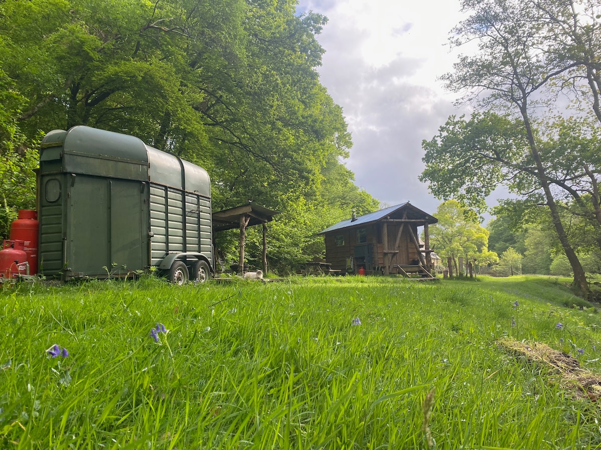 A beautiful hand built cabin nestled in the woods, idyllic setting next to a stream and surrounded by magnificent trees, the perfect place to immerse yourself in nature. Found at the end of an unmade track, with miles of nothing but woodland walks and wonderful hills to explore on foot or bike. Situated next to a stream with a glass bridge and beautiful little waterfall, with its own plunge pool. The hot shower and compost loo are set in a quirky horse box accessed across a board walk.