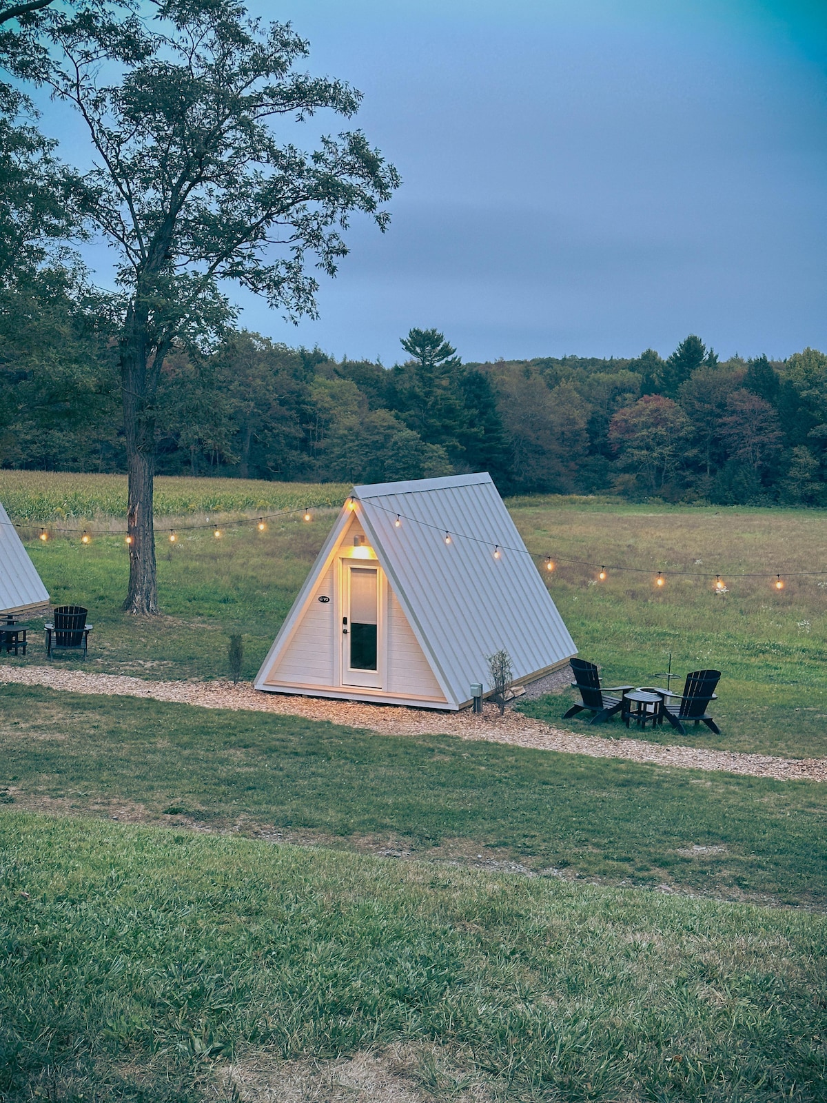 Escape to nature in a cozy glamping pod, offering the ideal mix of comfort and adventure in a peaceful setting. Each pod features a queen-size bed, a mini kitchenette with a coffee maker and microwave, and a dining table for two. Pods are equipped with heating and cooling, electricity, and WiFi. Though there's no bathroom inside, our luxury bathhouse with private stalls is just a short walk away and visible from your pod.