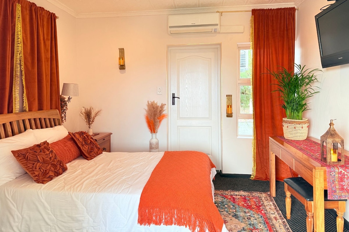 Luxurious and uniquely styled, this 26 sqm King Room features a bold feature wall and an en-suite bathroom with shower. Includes a Nespresso machine, DSTV, Wi-Fi, and daily gourmet breakfast. Guests enjoy a pool with mountain views, Lorsoni’s Restaurant (daily; dinner Thu–Sat), and a bar with local wines and craft drinks. We have two rooms in this category – Rooms 1 and 2. One will be assigned at check-in. Both offer the same layout, comfort, and amenities.