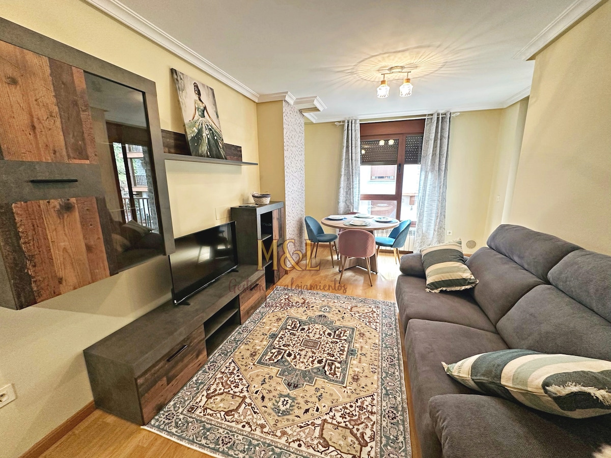 A estrenar! Reformado íntegramente en enero 2020! Fantástico apartamento en pleno Casco Histórico de Oviedo, frente a la Muralla Medieval. A 2 minutos de la Catedral y Gascona Sidra. PARKING EN El EDIFICIO. Apartamento de diseño y elegante decoración. - Salón con chimenea decorativa, sofá cama de 160 cm y colchón viscoelástico - Cocina completa ( lavadora y lavaplatos) - Dormitorio con cama de matrimonio de 180 cm, y TV:Netflix,Prime. - Baño completo - Garaje -Ascensor -WIFI y Netflix