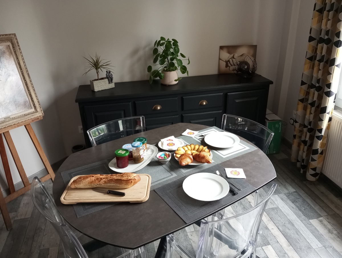 Dans une impasse d'un quartier calme, découvrez cette chambre bien décorée dans une maison très Café ou thé offert.Vous pourrez découvrir les environs d'Arras et de Douai. La maison se situe à 5 minutes de l'autoroute A1, et à 5 minutes à pieds de la gare SNCF qui dessert Douai et Arras. Commerces, centre-ville et espace aquatique à 2 pas. Profitez également d'un grand jardin. Possibilité de prendre le petit déjeuner sur place.(en supplément)