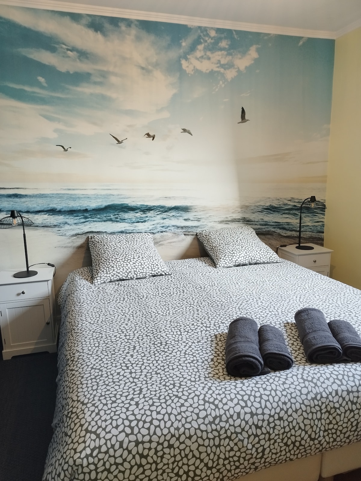 Chambre aux couleurs sobres et épurées. Dans le centre de Cayeux-sur-mer, accès immédiat aux commerces et à la plage en moins de 5 minutes à pieds. Chambre équipée pour 2 personnes avec salle de bain et toilettes privatifs. Possibilité de réserver les repas du soir en table d'hôte OU de préparer vous même votre repas dans la cuisine à partager. N'hésitez pas à réserver vos petits dej pour 7,50€ par personne Terrasse réservée aux voyageurs.