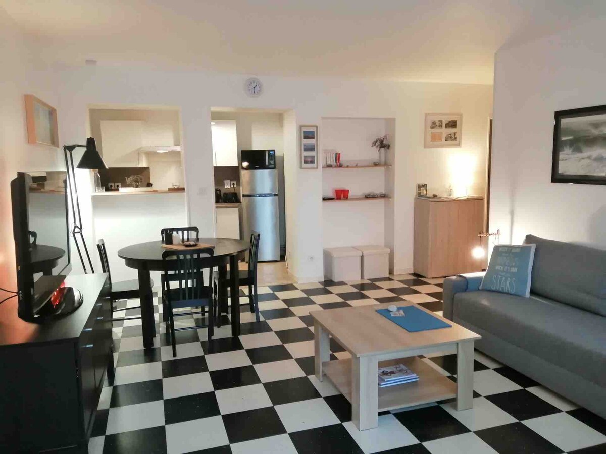 Logement très lumineux de 40 m² entièrement rénové à 100m de la plage et proche du centre-ville. Wifi. Cuisine neuve aménagée, frigo, micro-onde, lave-vaisselle, plancha, blender, machine Nespresso. Lit confortable 160x200 au 1er étage et convertible 120x190 au rez-de-chaussée, diffuseur musique Bluetooth Bose. Grande douche, radiateur sèche-serviettes. Petite terrasse avec table, chaises et transats. Terrain de pétanque à disposition.