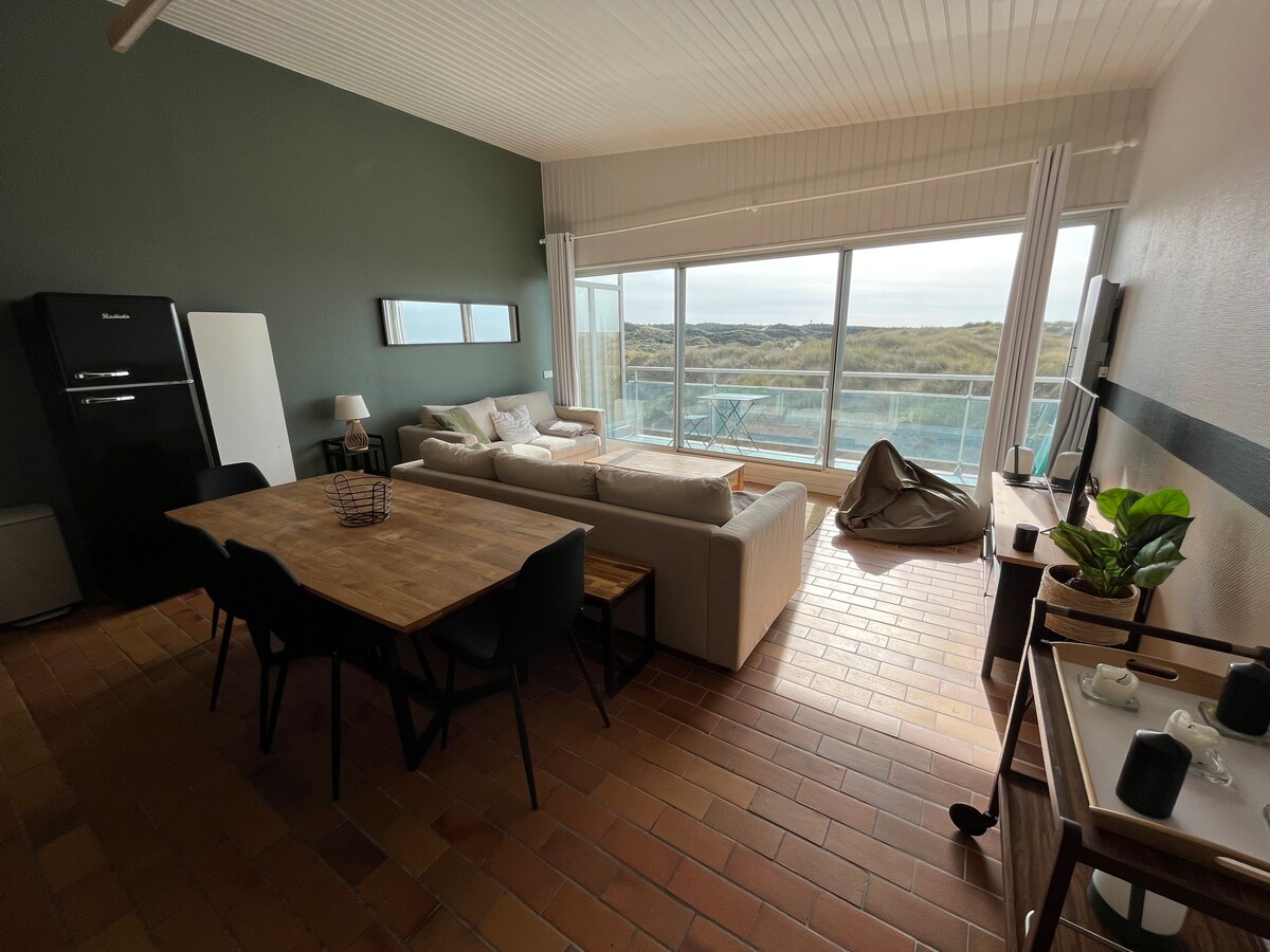Notre studio de 20m2 est un petit cocon cosy plein de charme au dernier étage avec ascenseur d'un immeuble à 50 mètres de la plage et des commerces et restaurants à proximité directe, au calme avec vue dégagée sur les dunes. Notre studio comprend un lit escamotable de 160*200 (hauteur 75 cm), une mezzanine pour un enfant (à partir de 6 ans) ou un adulte, un petit cocon comme une cabane! Vous bénéficierez d'un salon, une salle de bains, d'une cuisine, d'un balcon et d'un parking privé.