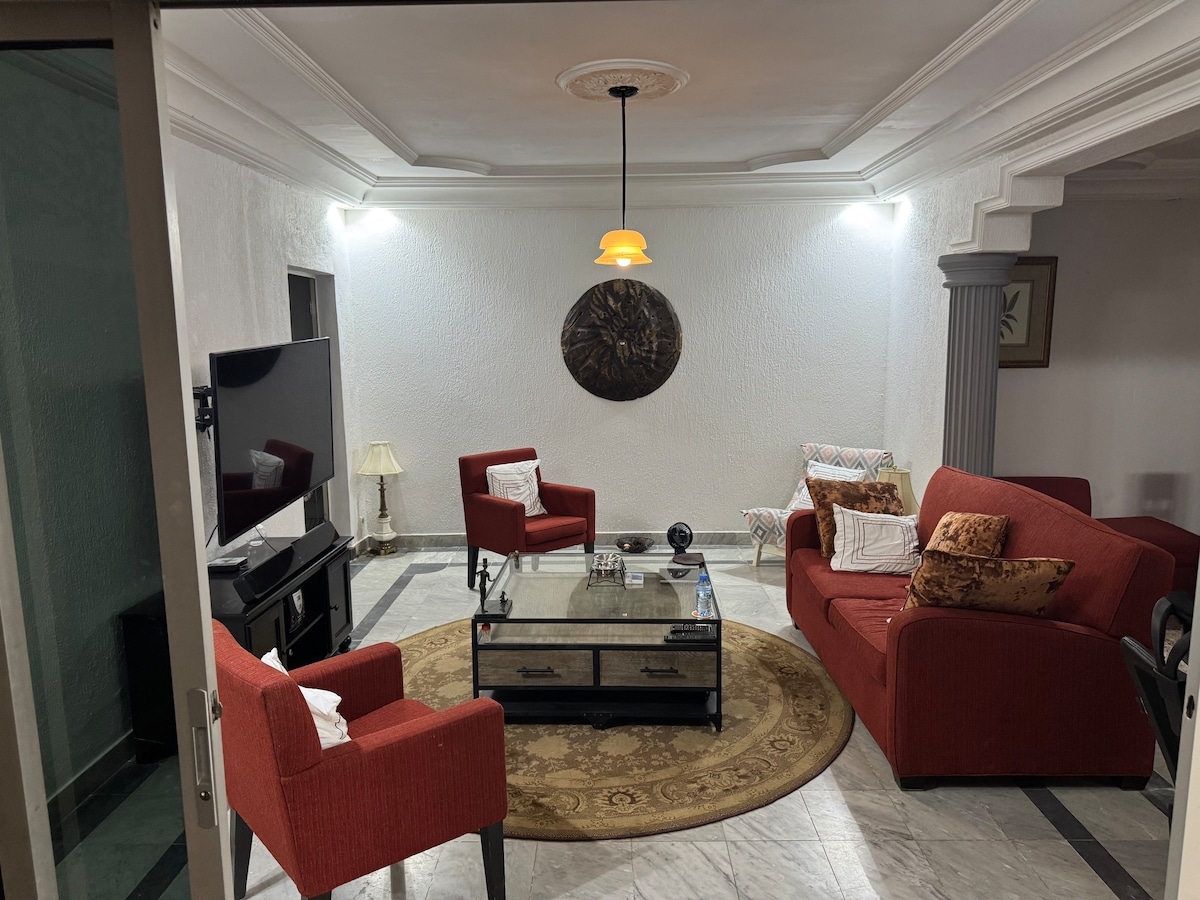 Serviced Villa Residence Somone is a Moorish-style home blending African art with modern amenities, just a five-minute walk from a sandy beach with calm waters. The villa offers spacious rooms with artisan-crafted rosewood furniture, a pool, a veranda, a serene garden, a panoramic rooftop terrace, fast Wi-Fi, a barbecue, and multiple air conditioners. Two dedicated staff members are available for cleaning and laundry. Cooking services are optional, and a driver can be arranged upon request.