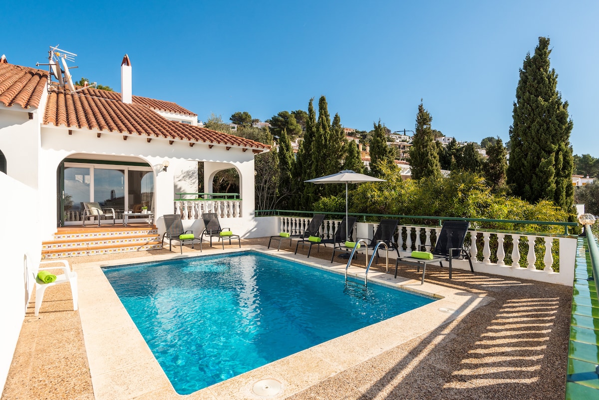 Discover Casa Timée, a newly renovated villa in the peaceful area of Cales Coves, just 5 minutes from Sant Climent and Calan Porter with its beautiful beach. The villa features a spacious outdoor area, including a private pool, an outdoor dining area, and a built-in barbecue. Inside, you'll enjoy all modern comforts: a living room, kitchen, four bedrooms, and two bathrooms, all on one floor. An ideal vacation home.