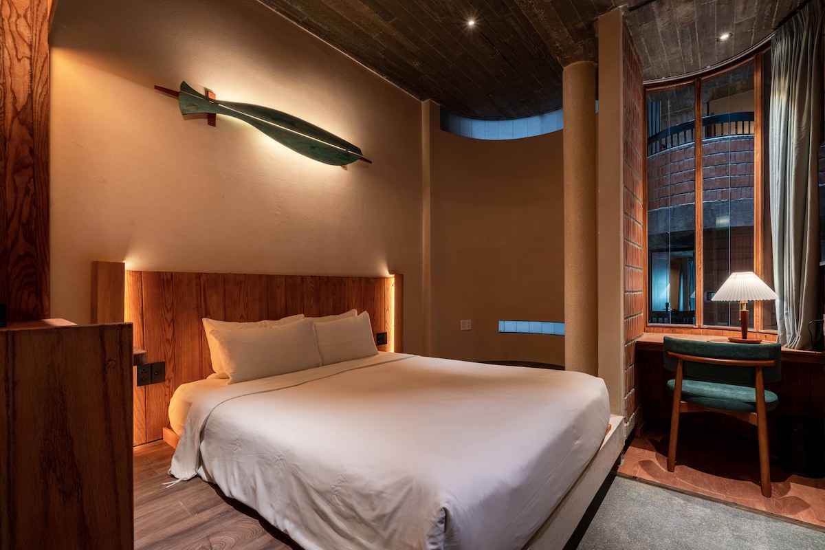 This room features warm wooden tones and soft natural light from a skylight at the heart of the building, creating a calm and inviting atmosphere. A work desk overlooking the hotel’s internal atrium, where daylight gently filters through the space. No window but very quiet. The room is equipped with a solid terrazzo bathtub in various shapes (round or elongated), offering a unique and relaxing bathing experience. Child under 5 years old is free, maximum 1 child.