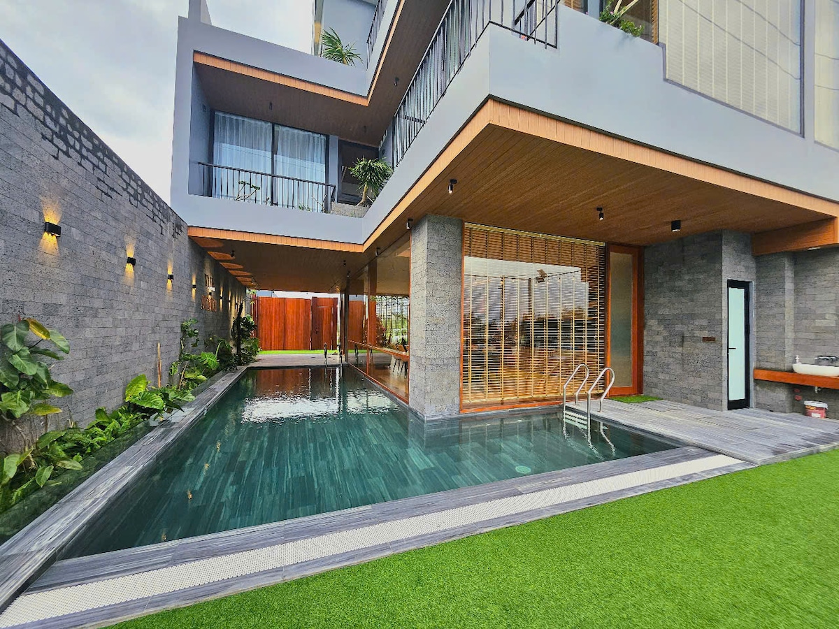 Tận hưởng kỳ nghỉ thoải mái tại biệt thự 5 phòng ngủ hiện đại gần cầu Thuận Phước, lý tưởng cho nhóm bạn hoặc gia đình muốn tìm một không gian riêng tư, đầy đủ tiện nghi tại Đà Nẵng. Biệt thự có hồ bơi riêng, thiết kế sáng sủa, nội thất hiện đại và không gian sinh hoạt chung rộng rãi – mang đến cảm giác dễ chịu, gần gũi như ở nhà. Một nơi hoàn hảo để nghỉ ngơi, tụ tập bạn bè hoặc tổ chức chuyến đi nhóm trong không gian riêng tư và thư giãn.
