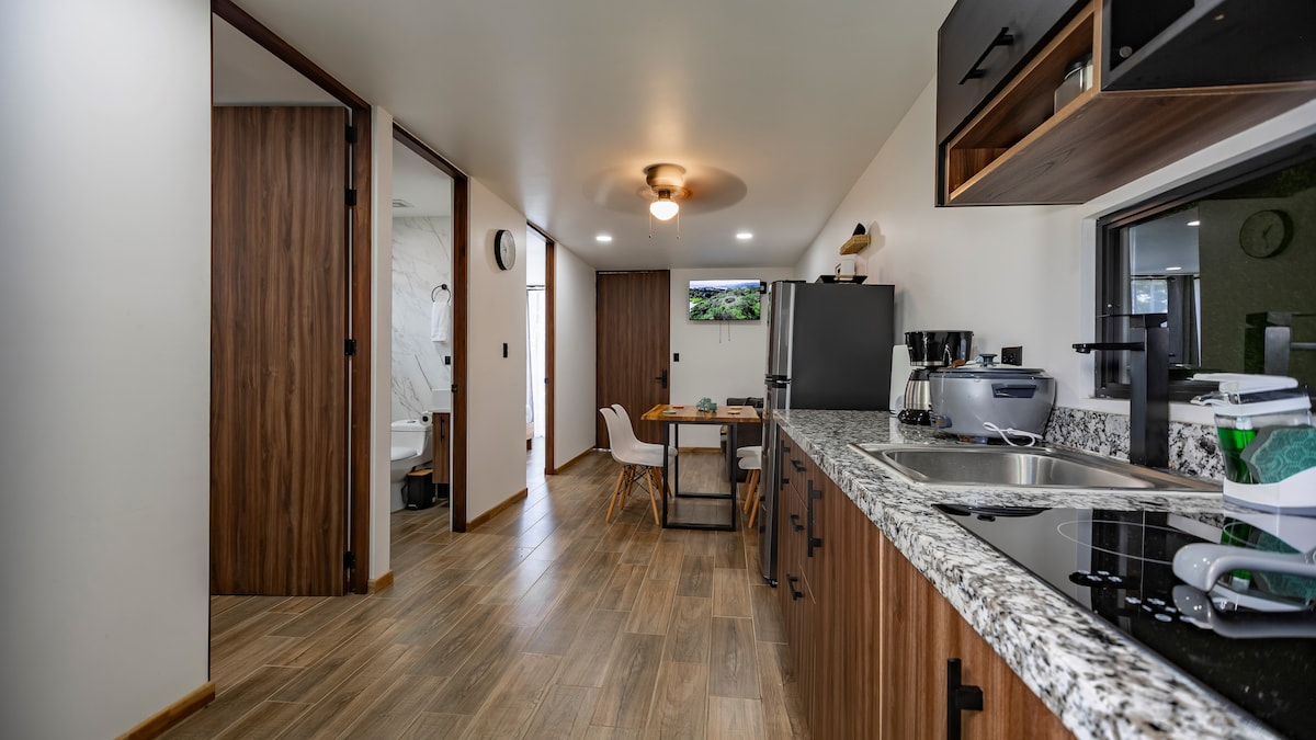 Sulára es un espacio de concepto abierto, donde su interior conecta en armonía con el exterior. Nuestro loft está ubicado a 60 mts de la calle principal transitada y a 2 km, 5 minutos en auto o 20 minutos caminando del centro de La Fortuna. Nuestro clima es tropical y junto al alojamiento se ubica una finca, por lo que podrás observar ocasionalmente ganado, aves, mariposas e insectos, entre otras especies que no representan peligro para el huésped y te permitirán conectar con un ambiente de paz.