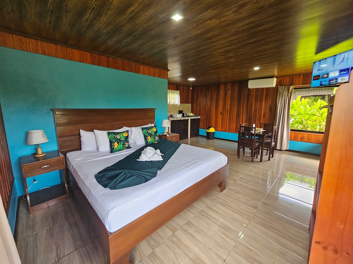 Located in a peaceful neighborhood just a 12-minute drive from La Fortuna downtown, you'll have all the privacy you need. Relax in this serene and 100% private space. Cool off in the private pool exclusively for you and your loved ones. You'll be surrounded by a lush tropical forest with beautiful wildlife sounds, and you can enjoy breathtaking views of the Arenal volcano right from your bedroom window. BBQ grill, games, Wi-Fi, TV, fully equipped kitchen, and all the amenities you might need
