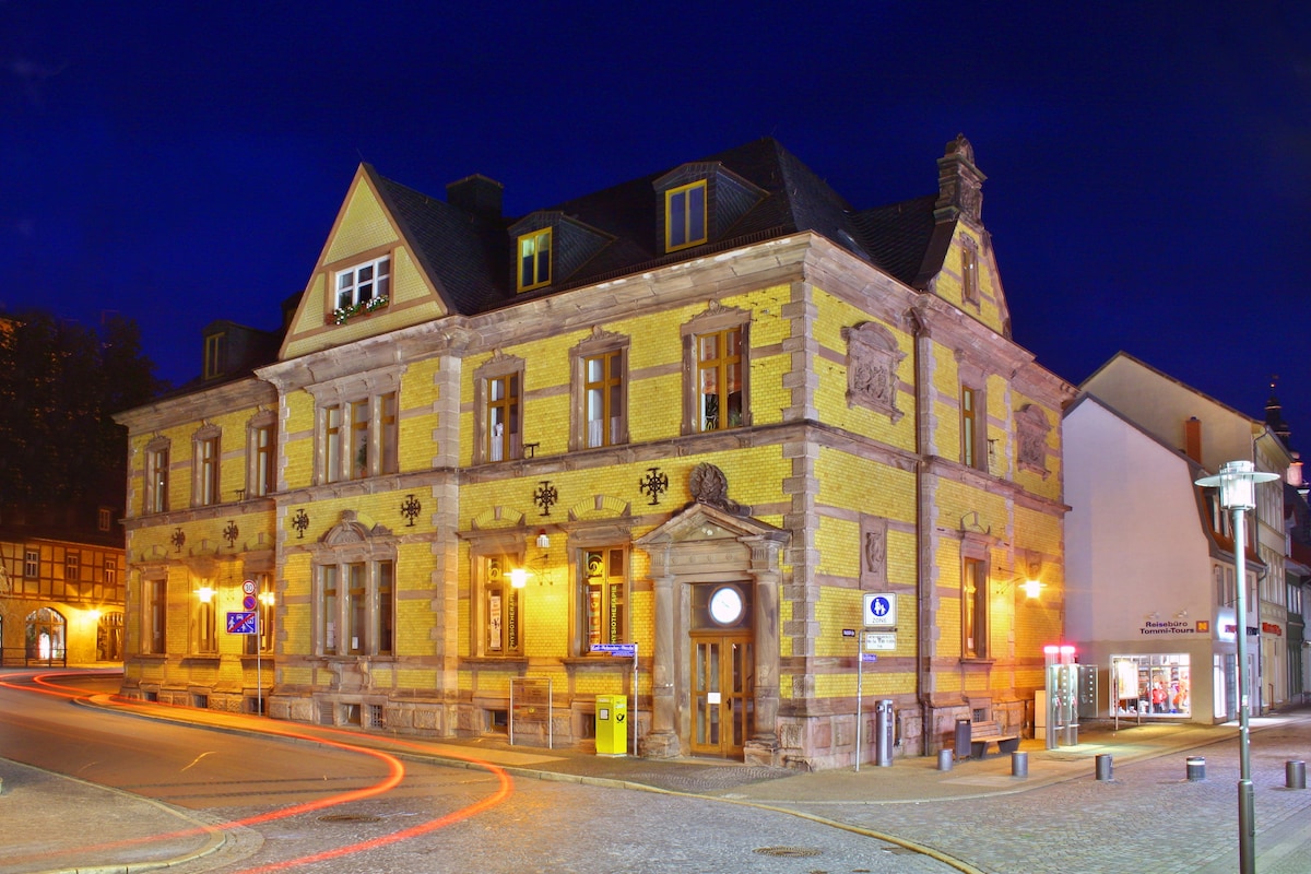 Gelegen im Zentrum Sondershausens neben dem Rathaus unterhalb des Schlosses, lädt unser Service Appartement ca. 48m² im Dachgeschoss des Hotels, sowohl zum Arbeiten als auch Entspannen ein. In unmittelbarer Nähe zum Schloss, bist Du in 150 m im Grünen und kannst einen Spaziergang in diesem wunderschönen Schlosspark genießen. Das Zentrum bietet Dir fußläufig zahlreiche Restaurants, Cafés, Musen & Einkaufsmöglichkeiten. Gönn dir eine Pause und entspann dich in dieser friedlichen Oase.