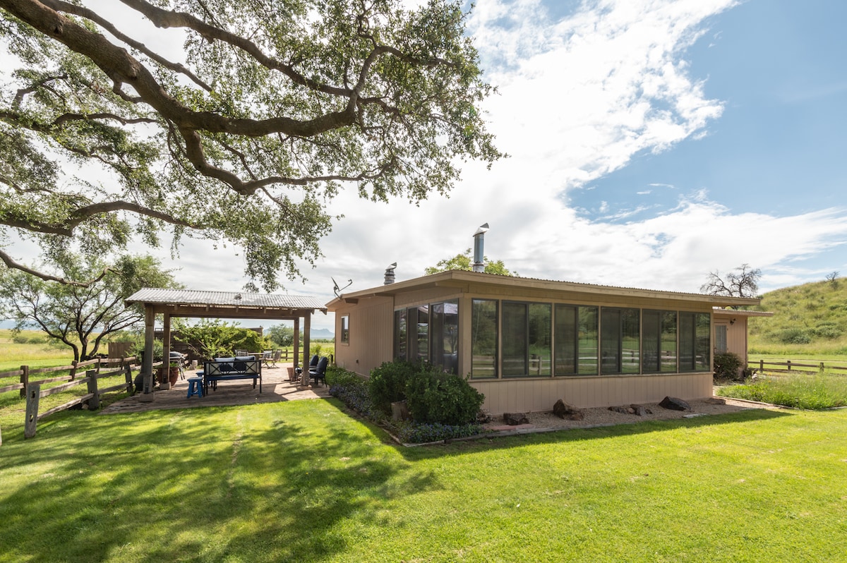 A guesthouse, nestled in a grove of mesquite trees, located just a block away from the local shops downtown awaits your arrival. A full kitchen, supplied with the basic conveniences, bedroom with queen size bed and twin sofa bed, and bathroom with shower, make this space a perfect fit for a couple or small family. The front living room has a futon couch and smart TV.