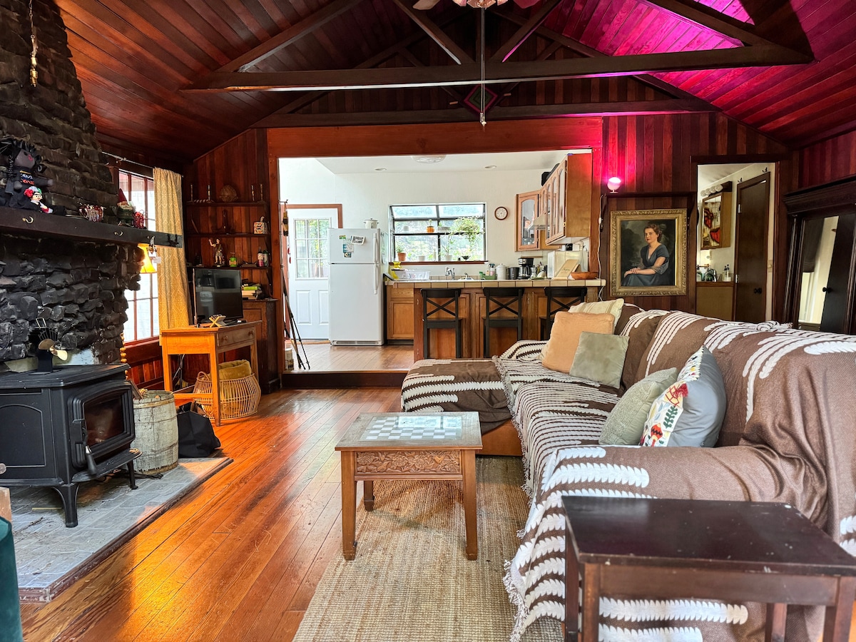Update: Beautiful sauna installed Fall 2025. Escape off the beaten path to a cabin with original beams & features, highly curated & beautifully decorated, amidst the emerald forest terraces of Monte Rio. Stay hygge with modern comforts. Multiple outdoors options to relax & tree-bathe - from a wild-garden patio, to the chandelier ‘outside living room’ pergola immersed in woods, plus a simple mature-redwood deck that catches the sun all day.