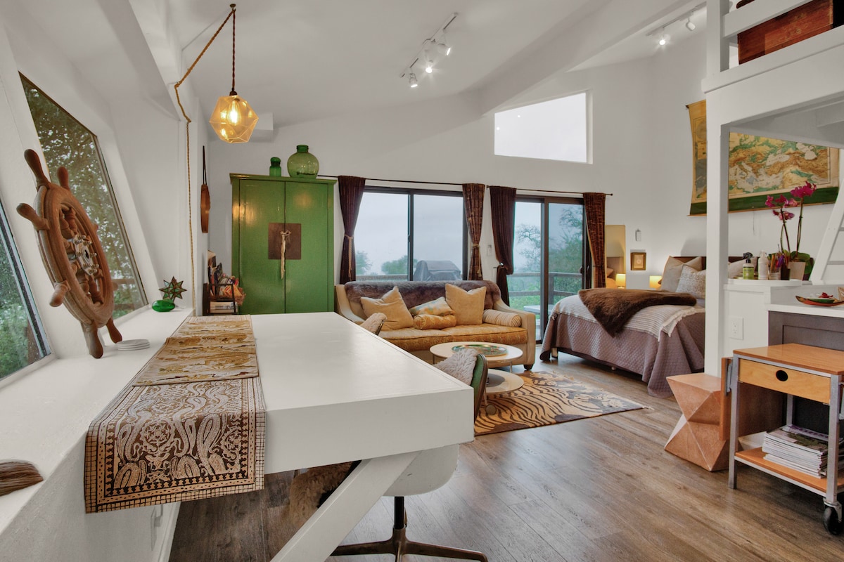 Enjoy the perched feeling of Sonoma Mountain's setting with sweeping views and nature. The slightly tamed wilderness with an olive orchard and gardens sets the tone as you chill on the redwood deck. This is a studio cottage with expansive views to the western valley and Marin. Mount Tam appears through the windows from your super comfy bed. This is a beautiful unique space adjacent to a mellow artist's studio. The kitchen isNOTE: Well behaved and Pre-Approved dogs available for a nightly fee.