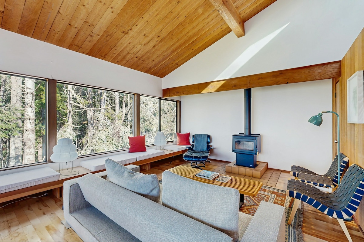 Escape to wine, water, nature, and cozy cabin comfort that's a short trip from SF (75 min) and only minutes to charming Healdsburg and Dry Creek Valley wineries. Right on the Russian River, our cabin is a great getaway for wine tasting, river fun (beach, canoe/kayak/SUPs), and Healdsburg (9 min). Built in 1949, we've kept the cabin's rustic charm (the antlers and the moose mount came with the place!), but updated it with modern design and conveniences. Perfect for couples or a family.