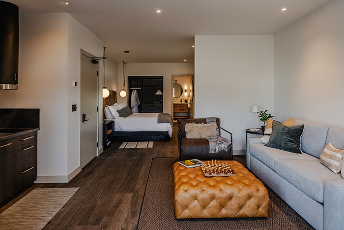 Our brand-new, ultra-luxurious 5 room hotel stands proudly in the heart of downtown Calistoga. These suites boast plush furnishings, custom-made designer furniture, and a color palette aimed at promoting rest and relaxation. Our rooms are equipped with kitchenettes featuring induction cooktops, refrigerators, dishwashers and offer queen sleeper sofas as well. PLEASE NOTE: This historic building spans two floors, and the hotel is situated on the second floor with no elevator access.