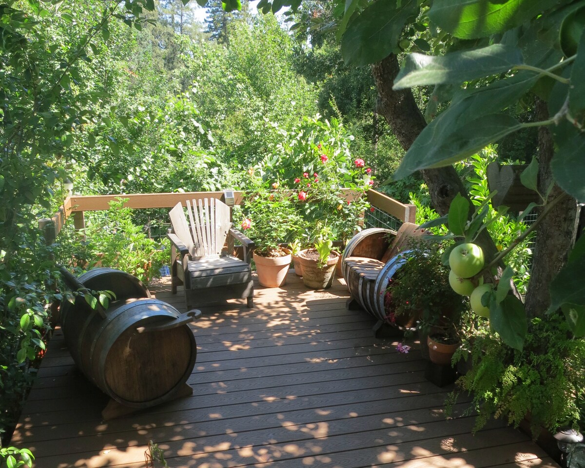 Charming studio plus separate cozy cottage, 1 bathroom, zen garden & patio under the redwoods. Quiet, comfortable, super clean. Minutes from Sonoma's historic plaza & wine tasting. A perfect sanctuary for a group of 1 - 4 guests. Enjoy our Be Happy hideaway, designed for visiting artists, writers, business travelers, traveling nurses, world explorers and wine lovers! Get more info about the unique layout, shared bathroom access & amenities. Must see Descriptions, Photos, Reviews, & Discounts!
