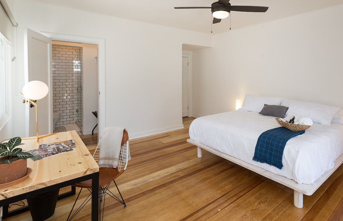 A modern single occupancy room styled with decor that makes you feel like you brought the beach back with you. This room is nestled in the corner to be your perfect home away from home. If features multiple amenities such as A/C, mini cooler, television, WiFi and private shower separate from vanity while you get ready. You’re sure to enjoy your stay in this sleek but cozy room.