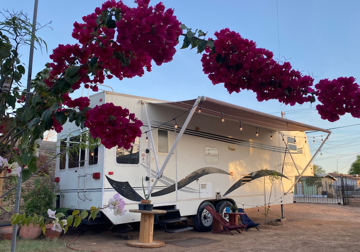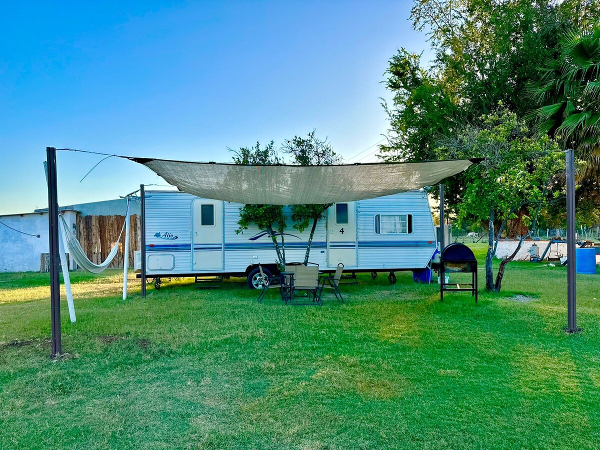 Camping Rv rental experience. A Naturalistic experience beach side, beautiful sunsets and the convenience of being on a beach side location. Some of the amenities are; a 1 queen been, 1 futon bed, dinning table, stove, refrigerator, microwave, AC , shower tub, toilet . Rv comes with blankets, toilet paper and soap. Rv park fee spot is not included. Please inquire about more than 1 night stay. Shades,chairs, tables, paddle boards, for rent. We have more Rvs . Rocky point fun rv rental.