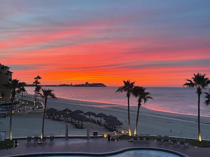 Beautiful 1 bedroom condo with fantastic "Sea of Cortez Lookout". Perfect view of the resort pool areas from the comfortable balcony with great views of local banana boats, fun cruises, Ultralights and jet skiers. C305 is tastefully decorated with king bed, queen size hidabed, quartz countertop, WiFi, two TVs, plus easy access from elevator. The resort has 3 pools, kiddy pools, jacuzzi, exercise facility, library. Great restaurant and on site.